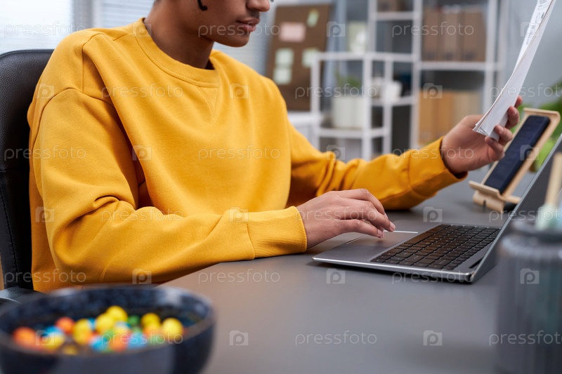Ближайшее изображение молодого чернокожего мужчины, работающего или учащегося на рабочем месте домашнего офиса