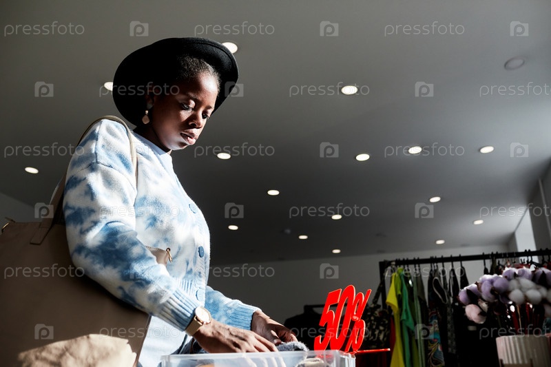 Стильная чернокожая женщина смотрит на подержанную одежду в запасном магазине