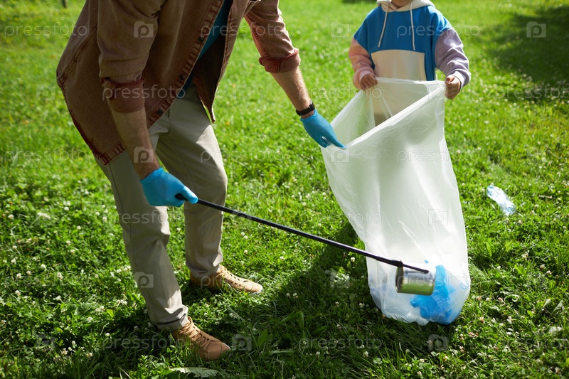 Отец и сын собирают мусор на улице, помогая очистить природу под солнечным светом