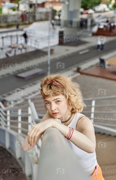 Молодая женщина смотрит на камеру снаружи, позируя на металлических лестницах