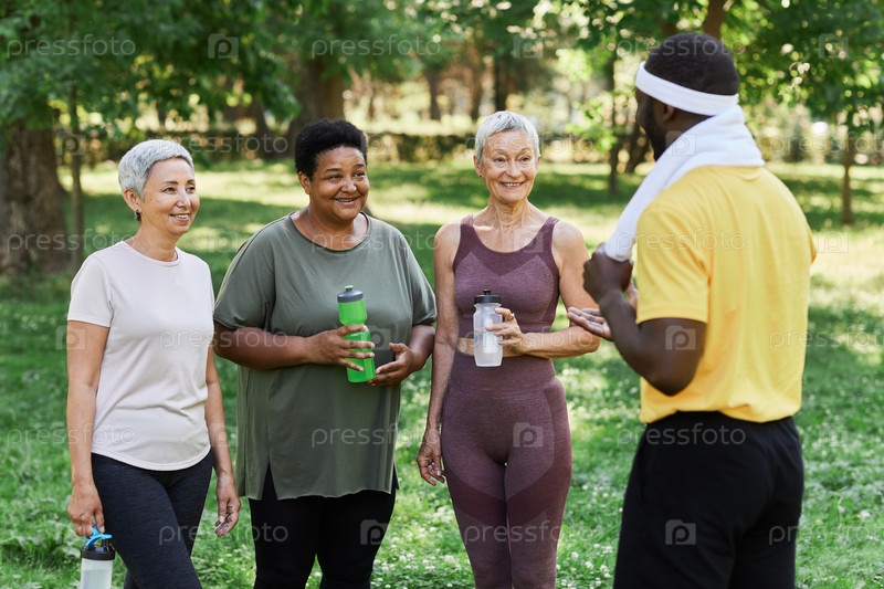 Пожилые женщины наслаждаются тренировками на открытом воздухе и разговаривают с тренером