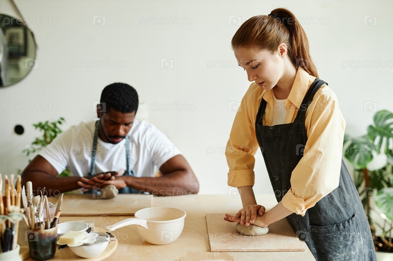 Женщина формирует глину и демонстрирует технику людям в керамической студии