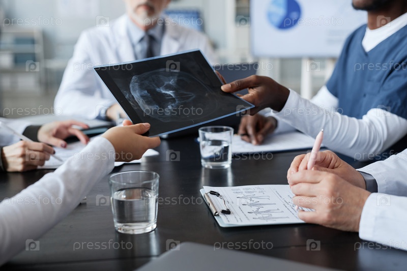 Рука молодого чернокожего мужчины в синей форме, передающего рентгеновское изображение коллеге