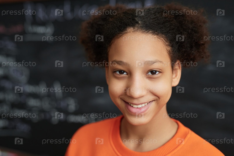 Черная девочка-подросток на доске в школьном классе, улыбаясь камере