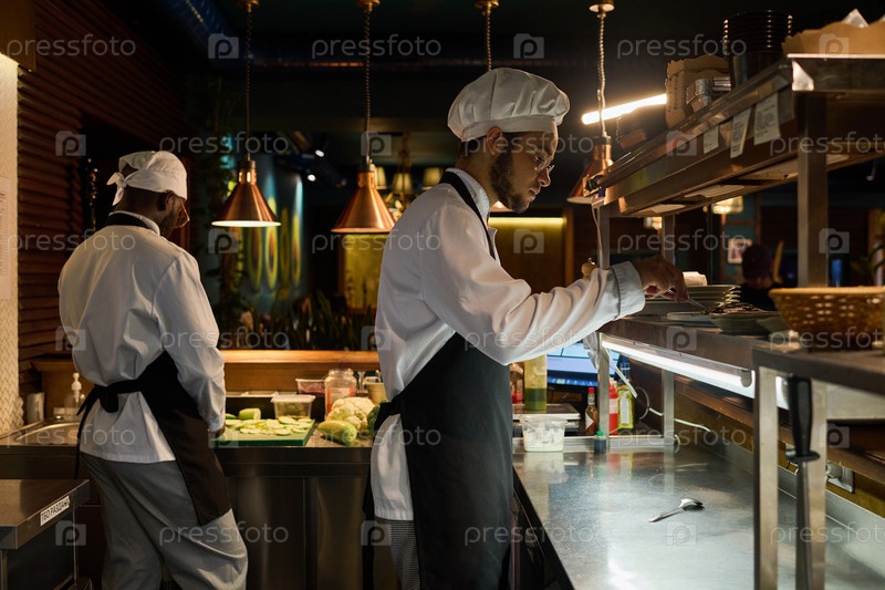 Боковой вид молодого мужского повара в форме, готовящего блюдо для подачи