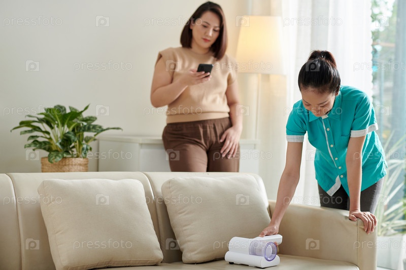 Служанка, использующая пылесос для чистки дивана