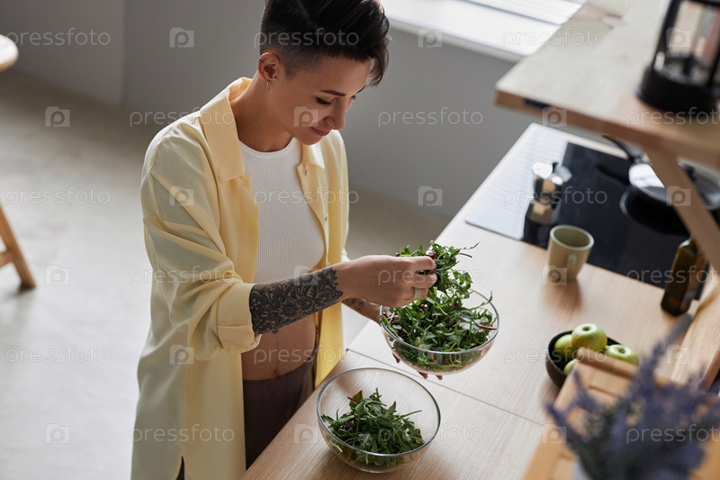 Татуированная женщина готовит здоровую еду на кухне, добавляя ругулу в салат