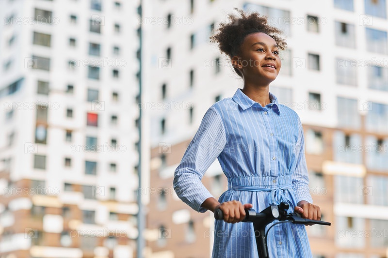 Счастливый подросток афроамериканская школьница едет на электрическом скутере