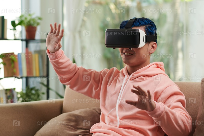 Радостный человек играет в игру с помощью очков VR