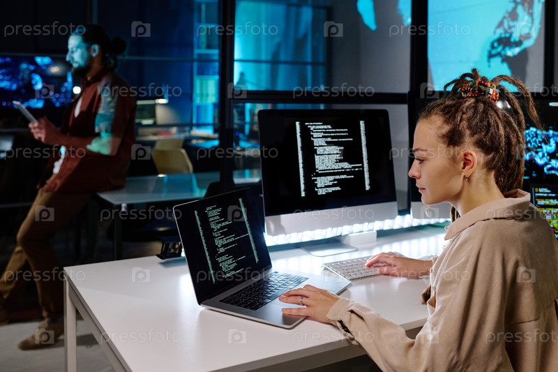 Серьезная женщина-программист с дредольками, декодирующая данные на экране ноутбука