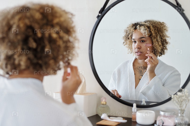 Молодая женщина делает массаж лица на кварцевом ролике