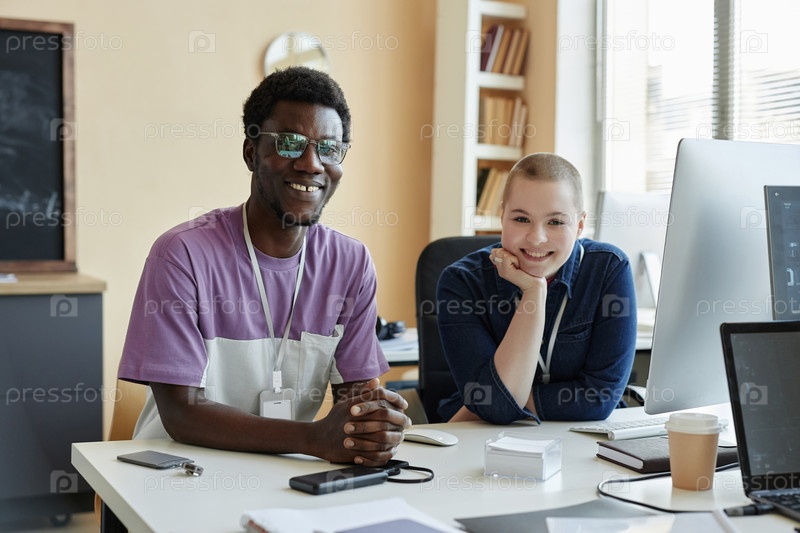 Счастливые молодые межкультурные менеджеры по кибербезопасности, сидящие на рабочем месте