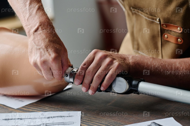 Мышечный ремесленник строит протезы ног на деревянном столе