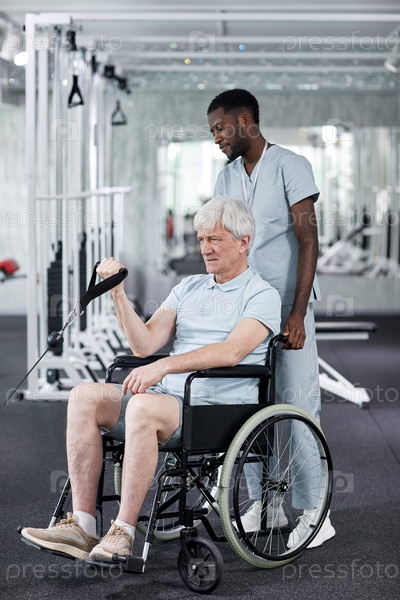 Пожилой человек в инвалидной коляске на реабилитационной клинике