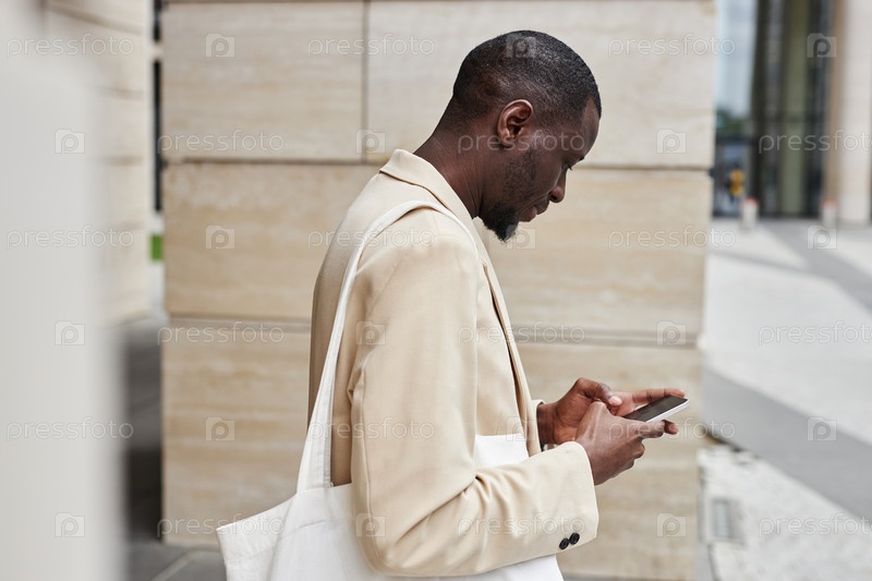 Афроамериканский менеджер-мужчина в белой формальной одежде отправляет сообщения на смартфоне