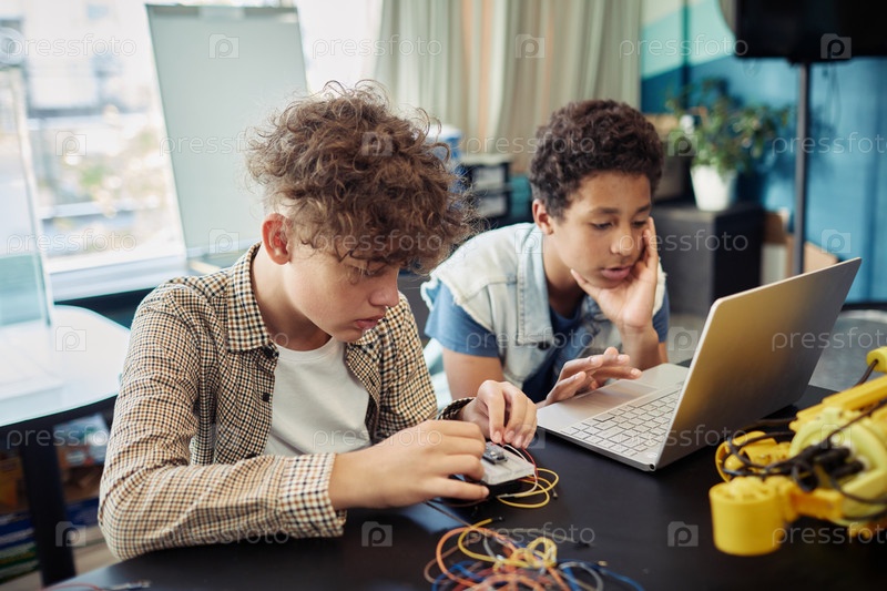 Два мальчика строят роботов в классе инженерии