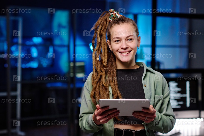 Молодая веселая женщина-иТ-менеджер с планшетом, смотрящая на камеру