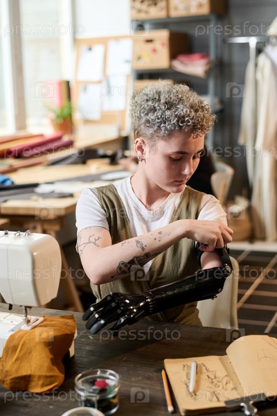 Современная молодая женщина устанавливает миоэлектрический протез руки во время работы