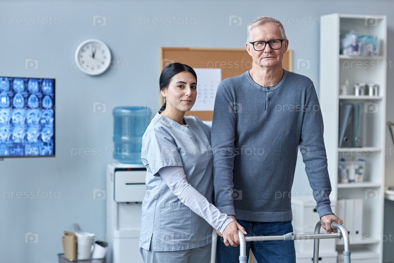 Медсестра и старший пациент смотрят на камеру в клинике с помощью мобильного ходунка