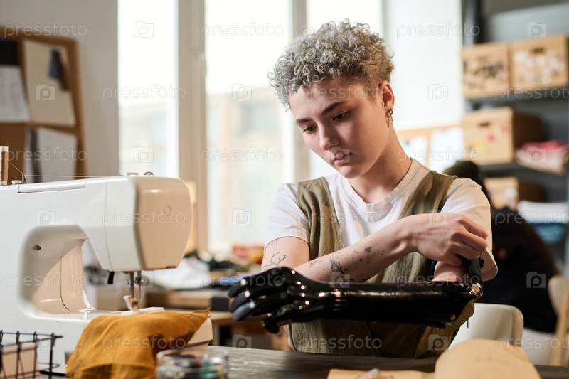 Молодая модная дизайнерка подбирает себе протез перед работой