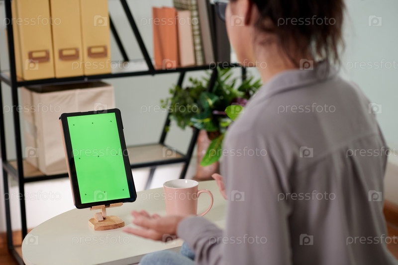Близкий план молодой бизнес-жены или фрилансера, сидящего перед планшетом