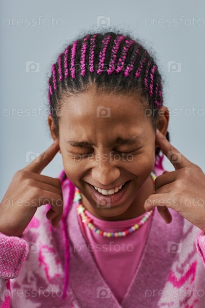 Черная девочка-подросток, которая носит розовые закрывающие уши на синем фоне