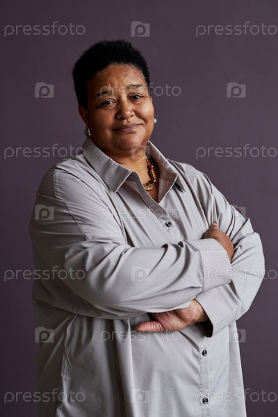 Чернокожая старшая женщина улыбается на камеру, уверенно стоит с перекрещенными руками