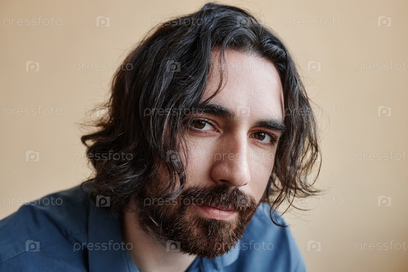 Взрослый мужчина с длинными волосами смотрит на камеру