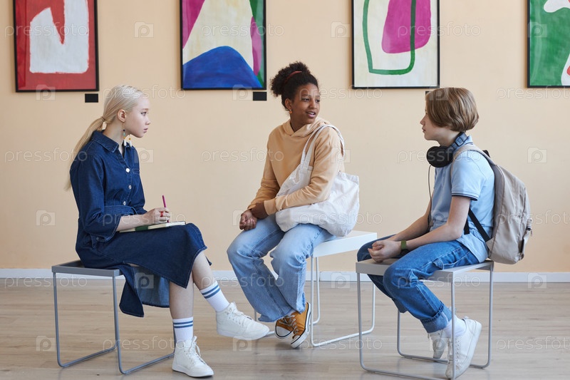 Подростки сидят в кругу, обсуждая искусство в современной художественной галерее или музее