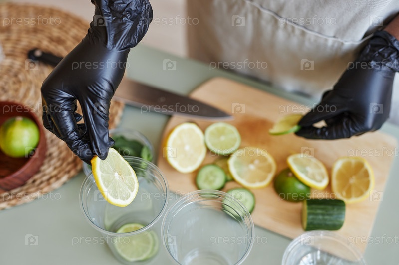 Близкий снимок женщины, добавляющей кусочки лайма в пластиковые чашки для лимонадных напитков в баре