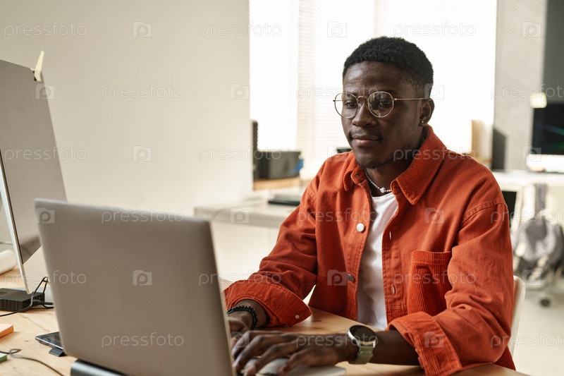 Молодой афроамериканский ИТ-инженер или веб-дизайнер смотрит на экран ноутбука