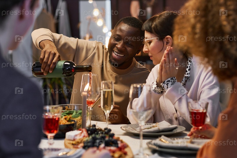 Счастливый молодой афроамериканец наливает красное вино на флейту своей девушки