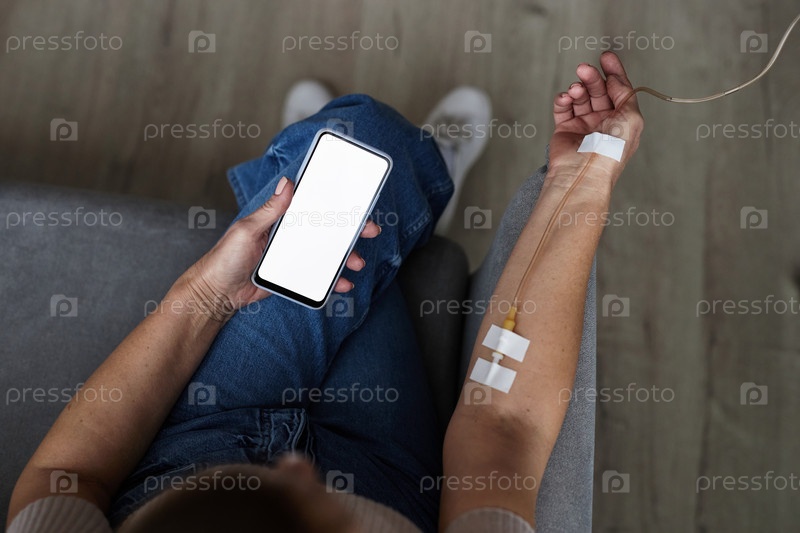 Ближайшее изображение неизвестного мужчины, использующего смартфон во время лечения внутривенной капелькой