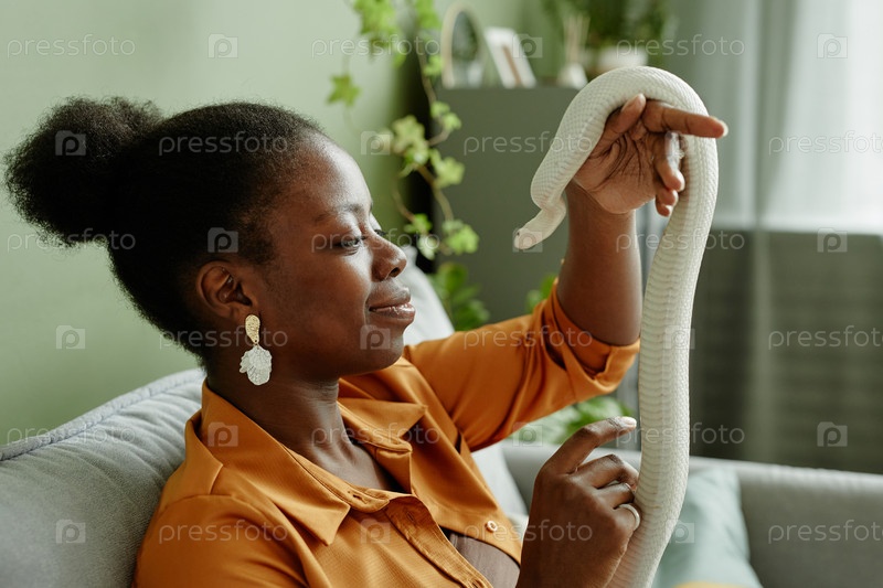 Боковой вид афроамериканской женщины с белой крысиной змеей в руках