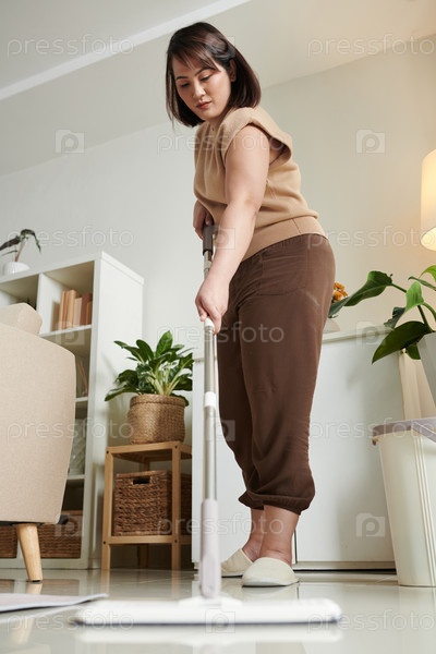 Женщина, стирающая плитки на полу