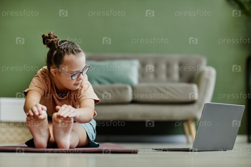 Молодая девушка с синдромом Дауна растягивается дома
