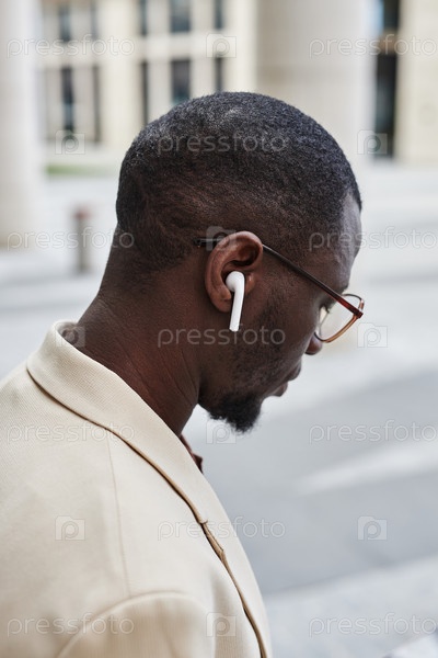Боковой вид молодого афроамериканского бизнесмена в очках и наушниках