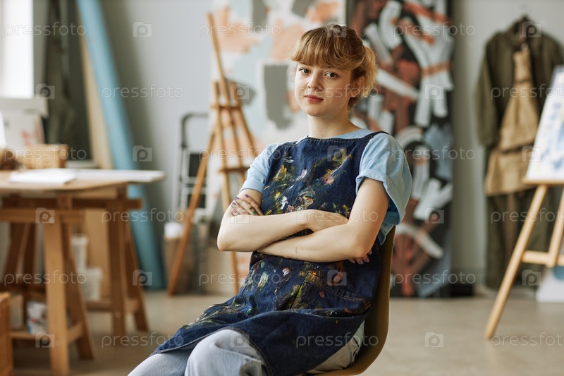 Молодая блондинка-художник или учительница живописи, сидящая на стуле