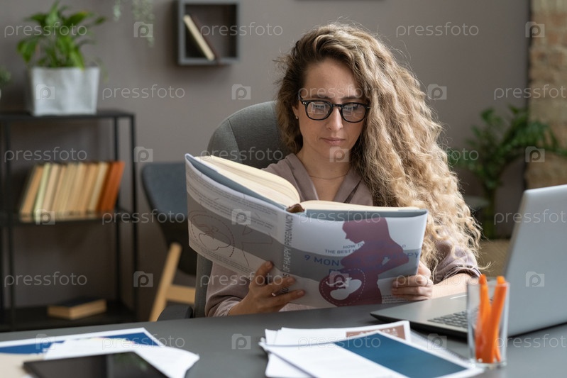 Деловая женщина читает книгу о беременности