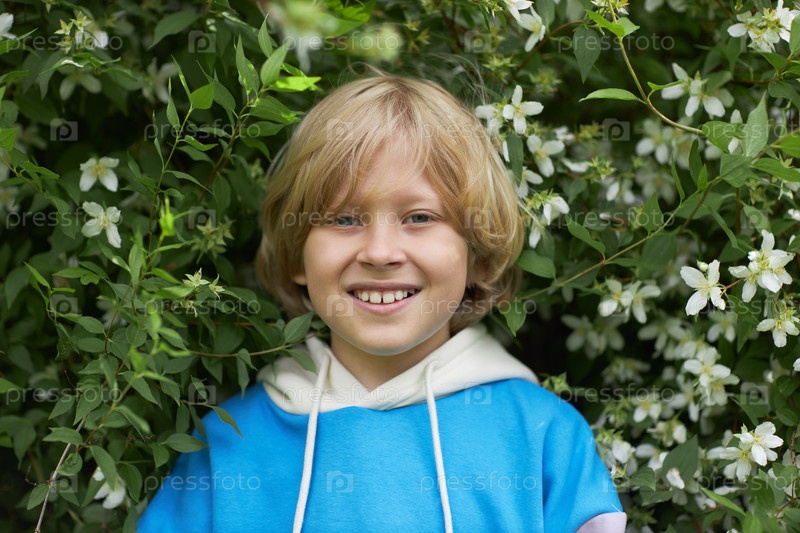 Улыбающийся блондин в цветущем кусте на свежем воздухе смотрит на камеру