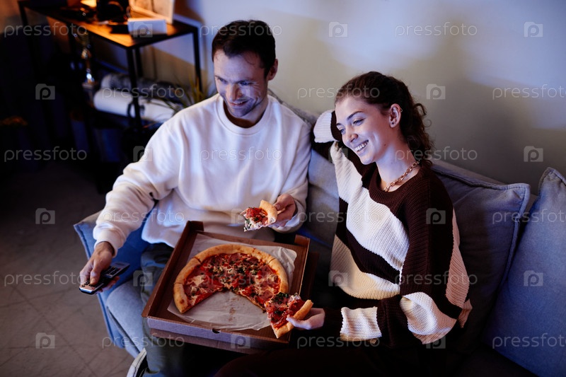 Пара ест пиццу и смотрит телевизор