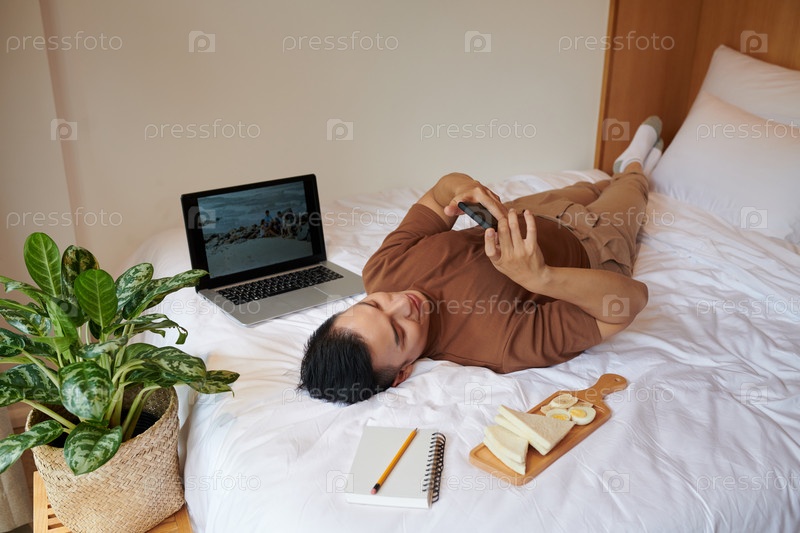 Молодой человек отдыхает на кровати