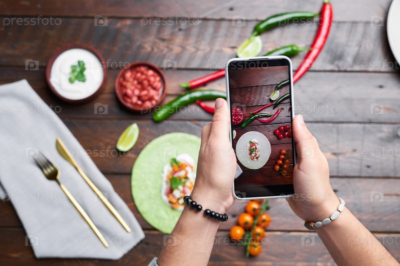Мужчина фотографирует еду на мобильном телефоне