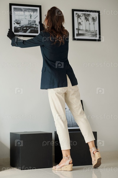 Задний вид молодой женщины в формальной одежде и черных перчатках, висящей на стене