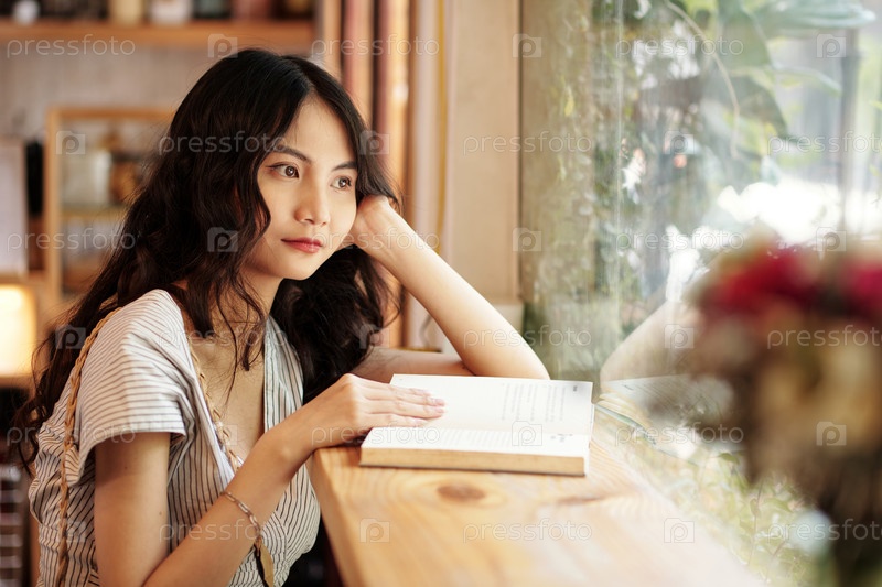 Женщина, сидящая в кафе с открытой книгой