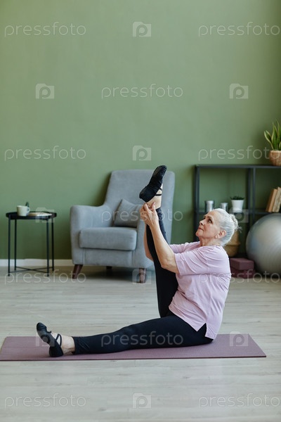 Старшая спортсменка в бежевой футболке и черных брюках тренируется на мате
