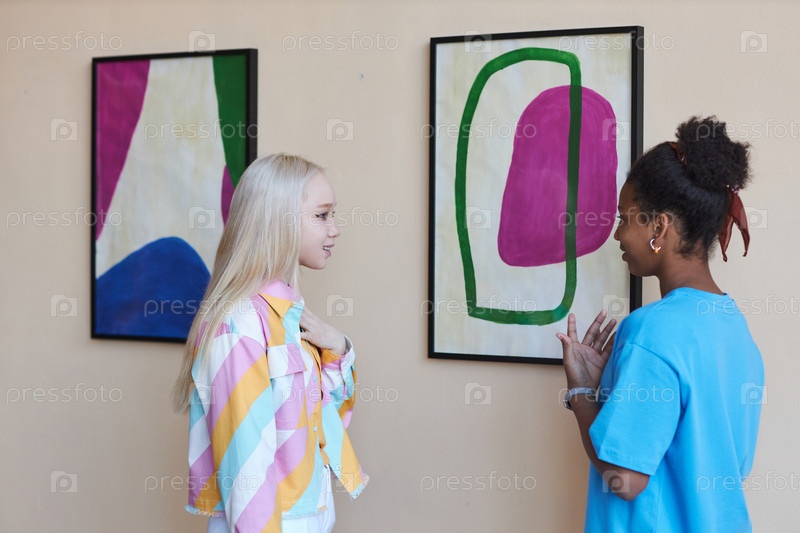 Две девочки-подростки обсуждают фотографии в художественной галерее
