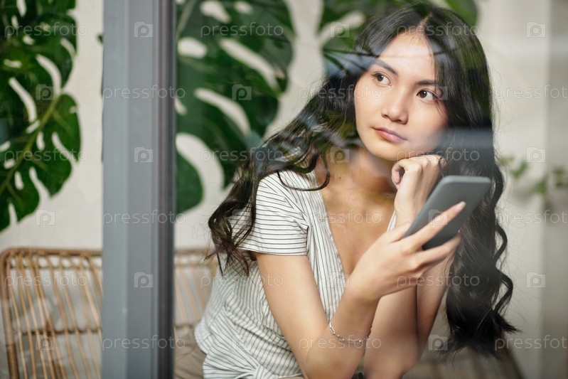 Вдумчивая молодая женщина со смартфоном