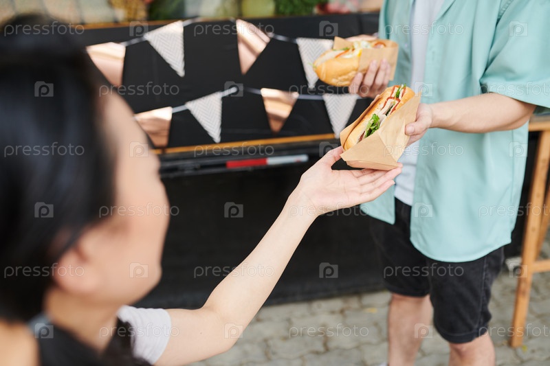 Близкий план молодой женщины, принимающей хот-дог из рук своего бойфренда