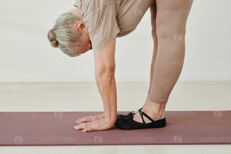 Боковой вид старшей активной женщины в бежевых леггинсах и футболке, сгибающейся вперед
